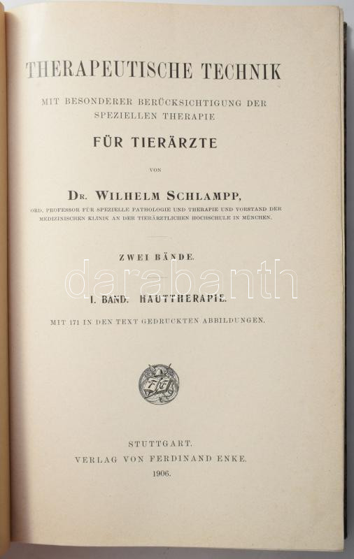 Schlampp, Wilhelm: Therapeutische Technik. Mit besonderer Berテシcksichtigung der speziellen Therapie. I. Band. Hauttherapie. Stuttgart, 1906, Ferdinand Enke, VII+[1]+419+[5] p. Nテゥmet nyelven. テ》kテカtテカtt fテゥlvテ。szon-kテカtテゥsben, jテウ テ。llapotban.