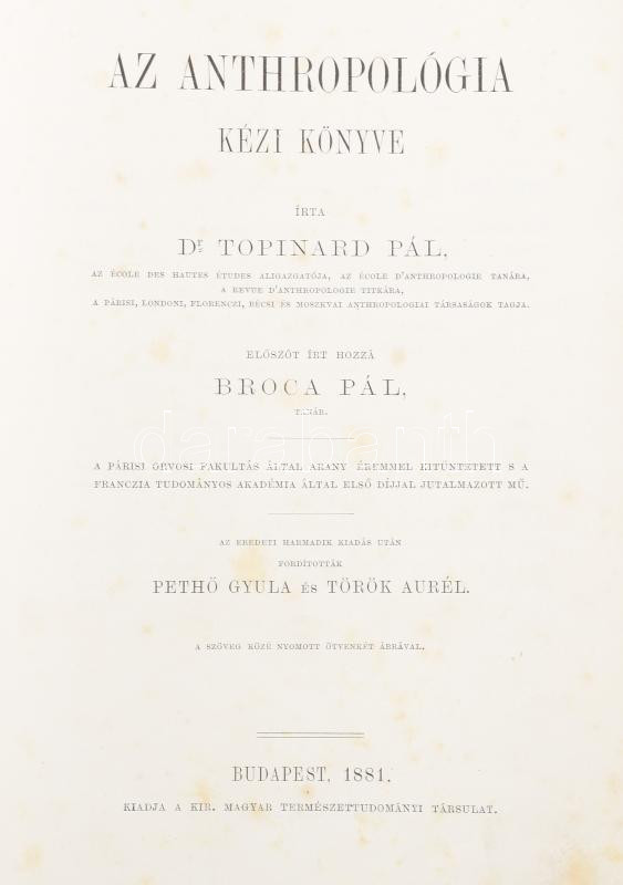 Topinard, [Paul] Pál: Az anthropológia kézi könyve. Broca Pál előszavával. Ford.: Pethő Gyula és Török Aurél. Bp., 1881, Kir. M. Természettudományi Társulat (Franklin-ny.), XXXII+768 p. Egyetlen magyar kiadás. Kiadói egészvászon-kötés, kopottas borítóval, kissé sérült gerinccel, helyenként kissé foltos lapokkal, tulajdonosi névbejegyzéssel (Wagner János).