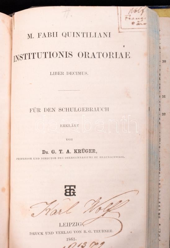 M. Fabii Quintiliani Institutionis oratoriae, libri decimus.Erklärt von Dr. G. T. A. Krüger. Leipzig, 1891.Teubner, 76p. Javított kartonált papírkötésben