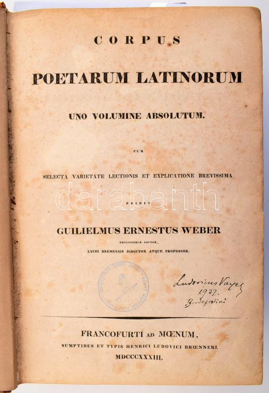 Corpus Poetarum Latinorum unoo volumine absolutum. Editit Guilielmus Ernestus Weber. 1833, typis Henrici Ludovici Broenneri. Ludovicus Vayer (Vayer Lajos?) névbejegyzésével. Bordázott gerincű félbőr kötés, gerinc sérült, kopottas állapotban.