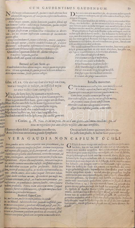 Iacob Cats: Alle de Wercken. Amsterdam, 1658, Jan Jacobz Schipper, 1 (díszcímlap) t.+16+164+20+26+2+27-30+4+15+1+5+195+7+2+52+8+180+16+192+12+193-265 [helyesen 261]+9+8+74+6+81-104+34+6+8+6+40 [helyesen 42]+4+108+8+64+1-2+3-12 p. Holland nyelven. Rendkívül gazdag szövegközti és egészoldalas rézmetszetű képanyaggal illusztrált. Korabeli egészbőr-kötésben, kopott borítóval, sérült gerinccel és táblákkal, kissé foltos lapokkal, restaurált és néhány (4-5) részben pótolt lappal, valamint az utolsó 5 lap kézzel írt pótlás, néhány lapon szakadással, az első díszcímlap sérült, egy kétoldalas tábla a szélein sérült, hiányos.