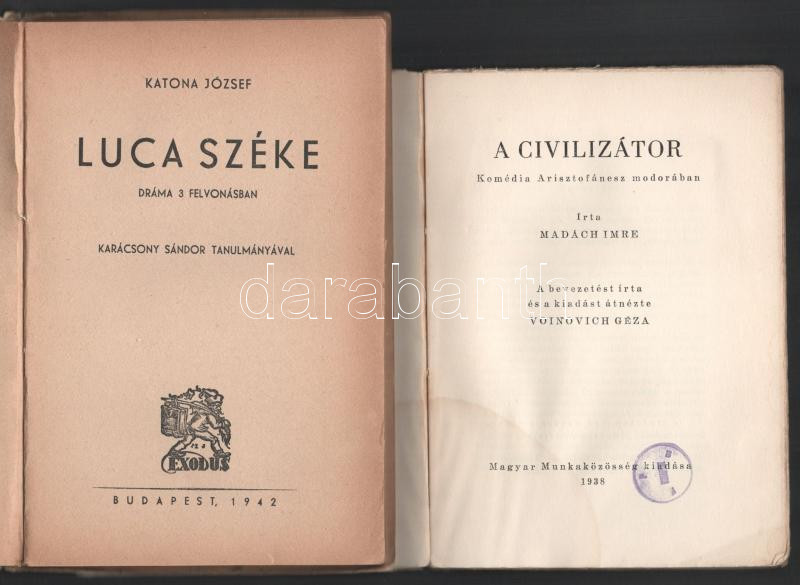 2 db könyv - Katona József: Luca széke. Bp., 1942, Exodus. Kiadói papírkötés, kopottas állapotban. + Madách Imre: A civilizátor. 1938, Magyar Munkaközösség. Kiadói papírkötés, foltos.