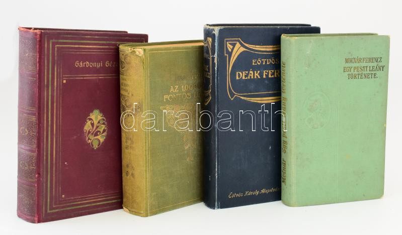 4 db régi könyv: Molnár Ferenc: Egy pesti leány története. Bp., 1905, Magyar Kereskedelmi Közlöny. ElsÅ‘ kiadás. Kiadói aranyozott, dombornyomott egészvászon-kötés, kissé foltos borÃtóval, egy kijáró lappal. + Eötvös Károly: Deák Ferencz és családja. II. köt. Eötvös Károly Munkái XIV. Bp., 1908, Révai. Második kiadás. Kiadói aranyozott, szecessziós egészvászon-kötés, kissé kopottas borÃtóval, a gerincen kis sérülésekkel. + Gárdonyi Géza: LeánynézÅ‘ben. Julcsa kútja. Két regényke. Bp., é.n., Dick Manó. Kiadói aranyozott, festett egészvászon-kötés, kissé kopottas borÃtóval és gerinccel. + Twain, Mark: Az 1,000.000 fontos bankó és más novellák. Ford.: Bálint Lajos. Bp., é.n., Athenaeum. Második kiadás. Kiadói aranyozott, szecessziós egészvászon-kötés, kissé foltos, kopottas borÃtóval, a gerincen sérülésekkel.