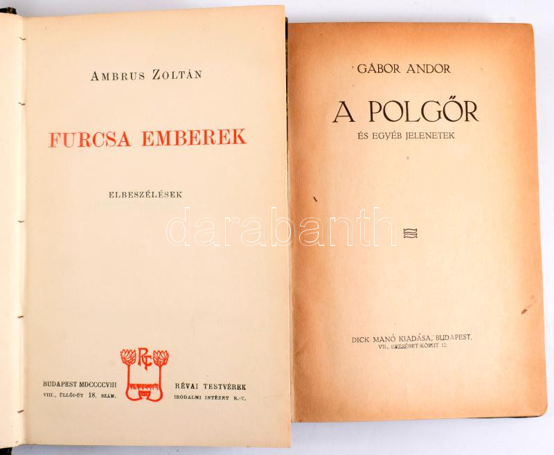 Ambrus Zoltán: Furcsa emberek. Ambrus Zoltán munkái XII. Bp., 1908, Révai. + Gábor Andor: A polgőr és egyéb jelenetek. Bp.,én.,Dick Manó. Átkötött szecessziós virágmintás borítókkal, bennük ugyanolyan szecessziós, erotikus, ex libris-szel: Ex Libris No. ..., klisé, papír, jelzett a dúcon (BE), 14x10 cm