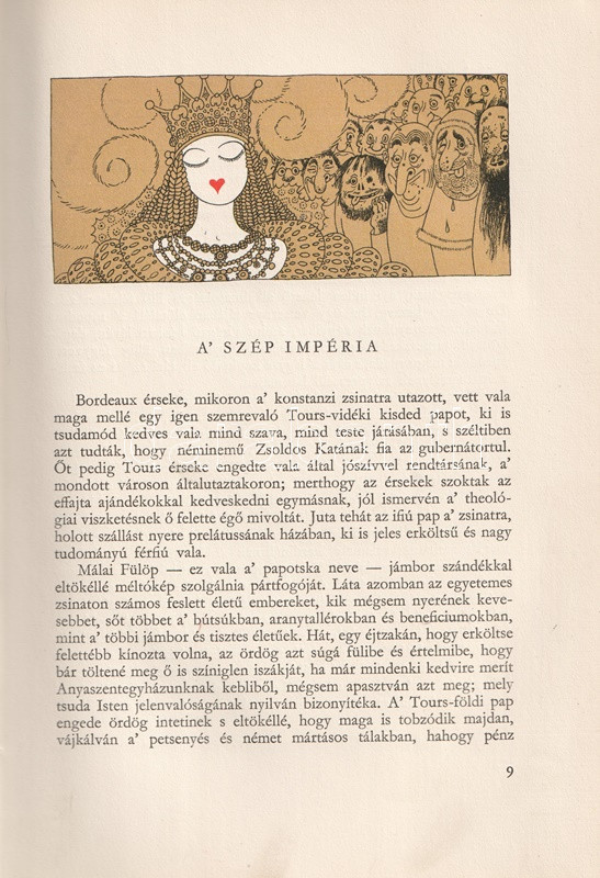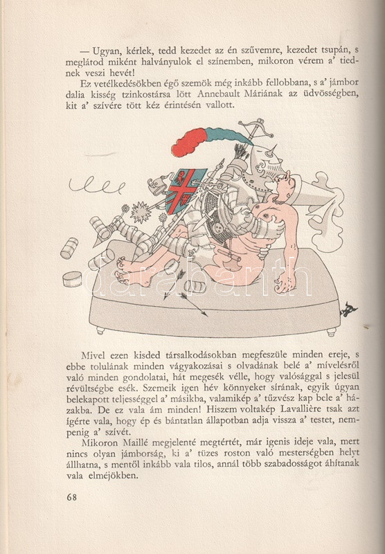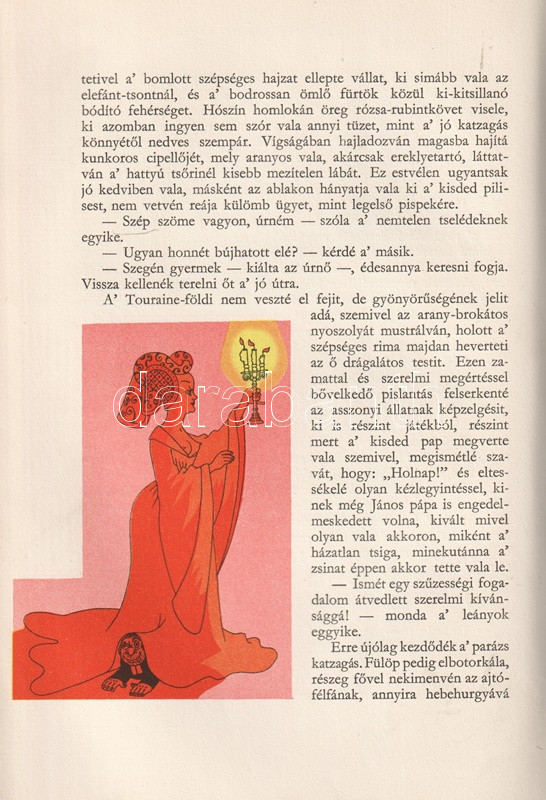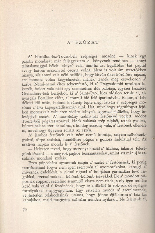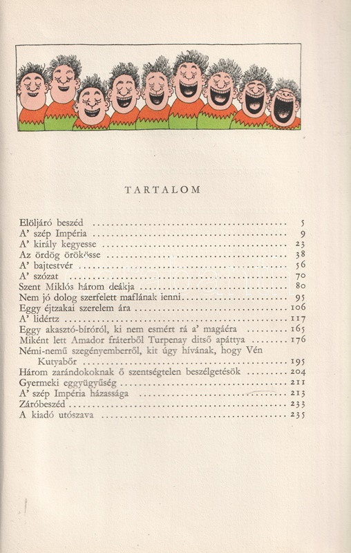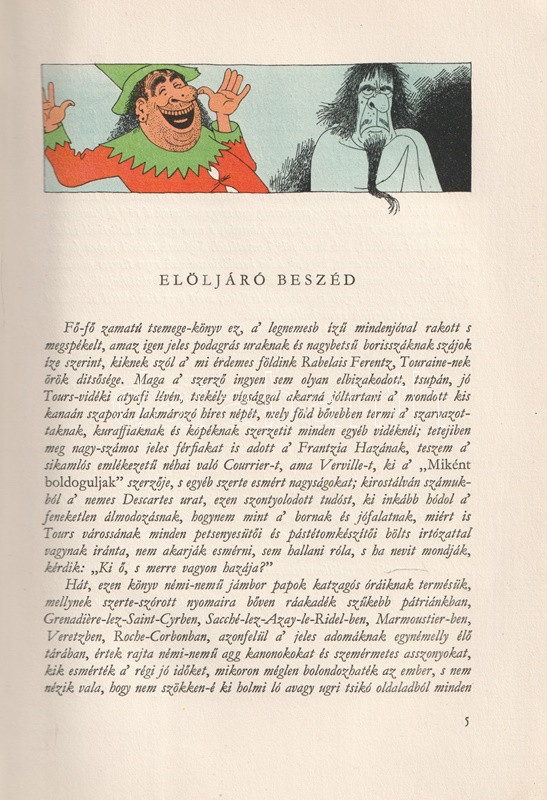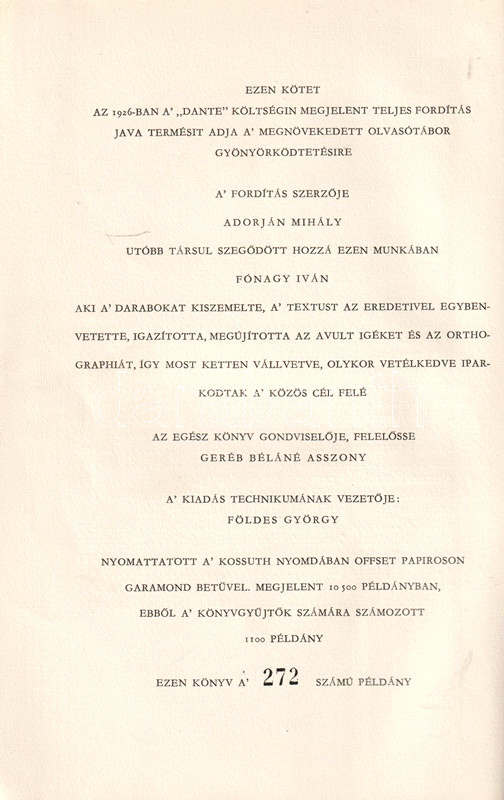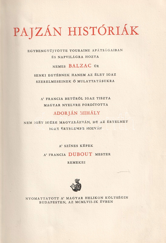 Albert Dubois francia karikaturista színes rajzaival illusztrált bibliofil kötetünk kolofonja: "Ezen kötet az 1926-ban a "Dante" költségin megjelent teljes fordítás java termésit adja a' megnövekedett olvasótábor gyönyörködtetésire. A' fordítás szerzője Adorján Mihály. Utóbb társul szegődött hozzá ezen munkában Fónagy Iván, aki a' darabokat kiszemelte, a' textust az eredetivel egybenvetette, igazította, megújította az avult igéket és az orthographiát. Nyomtattatott a' Kossuth Nyomdában offset papíroson Garamond betűvel. Megjelent 10,500 példányban, ebből a' könyvgyűjtők számára számozott 1100 példány. Ezen könyv a' 272. számú példány".