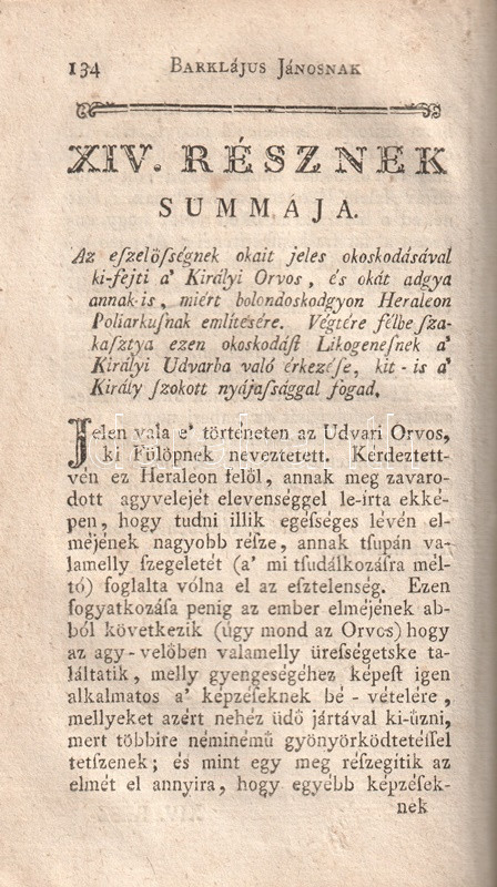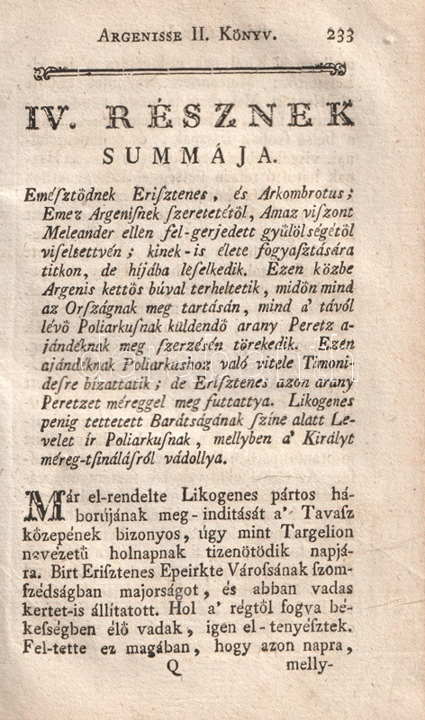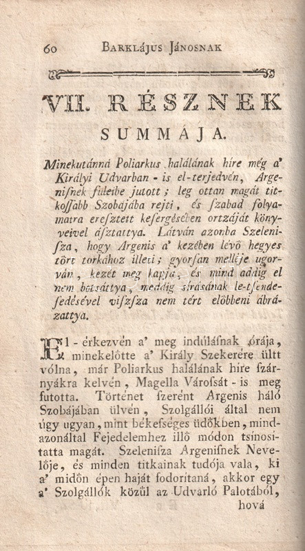 John Barclay (1582-1621) francia-skót származású író, költő, szatirikus, a neolatin irodalom meghatározó szerzője. Az angol királyi udvar befolyásos udvari költőjeként működő Barclay szatírái mellett több pápa- és jezsuitaellenes pamfletet írt. A katolikus neveltetését később egyre komolyabban vevő költő élete második felében Rómába költözött és az ottani irodalmi körökkel kötött barátságot. Argenis címmel írt kalandregénye a szerelmi történet mellett komoly politikai tendenciát mutat, a kalandregény szövetét olykor a helyes uralkodásról, az igazságos teherviselésről írt kitérők szakítják meg; egyes életrajzírói ezekben a részletekben a szerző főnemesség elleni tendenciáit vélték felfedezni. A politikai kitérőkkel vegyített barokk szerelmi kalandregény a XVII. század újlatin prózaírás egyik csúcsának számított. A sokak által csodált újlatin regény magyarra fordításával a XVIII. század végén többen is próbálkoztak: Kövesdi Boér Sándor erdélyi táblabíró és Fejér Antal eperjesi jegyző fordítása egyaránt 1792-ben jelent meg. Fordítónk, Fejér Antal az előszóban azzal a hazafias okkal magyarázza fordítását, hogy immár minden csinosodott nemzet lefordította az újlatin prózaírás ékességét, a magyar irodalom sem zárkózhat el tőle. Emlékezetes magyarsággal írt és némi szögletes bájjal bíró fordítása azonban nem lelt újabb kiadásra: a politikai tendenciájú újlatin kalandregény kissé késve érkezett a magyar piacra. A mű három kötetben teljes.