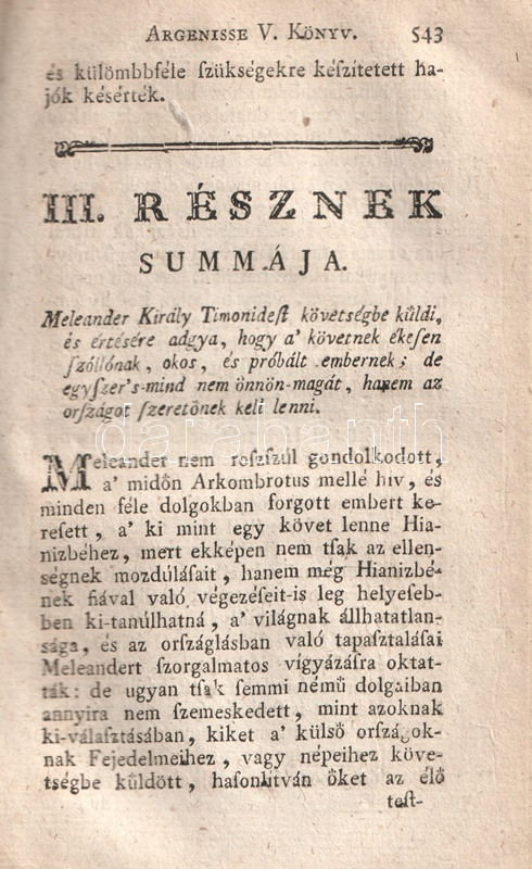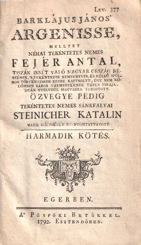 Barklájus János' Argenisse, mellyet néhai tekéntetes nemes Fejér Antal deák nyelvbűl magyarra fordíttatott. Harmadik kötés.