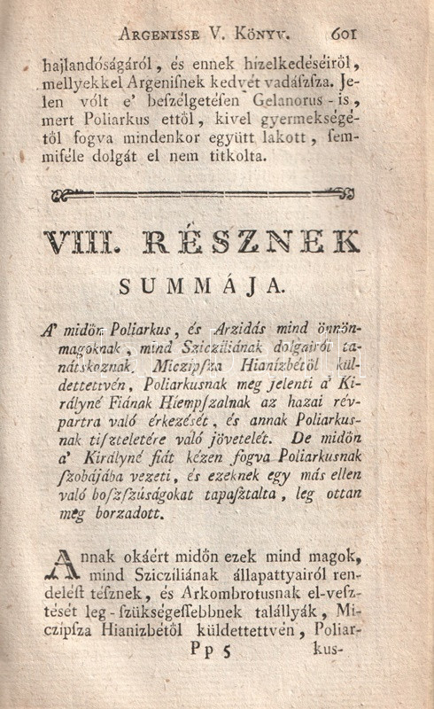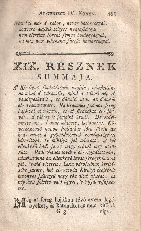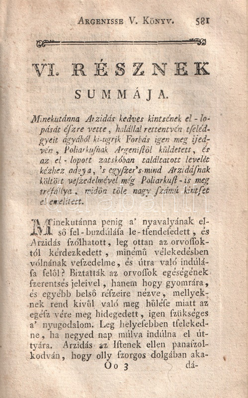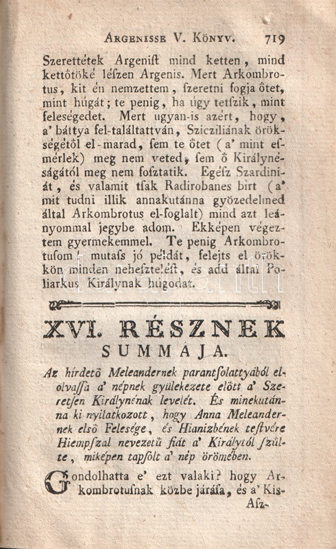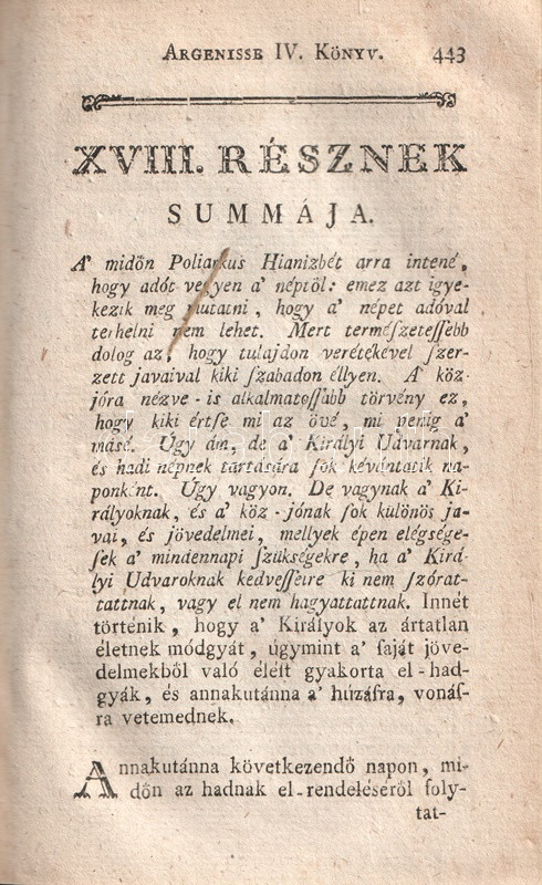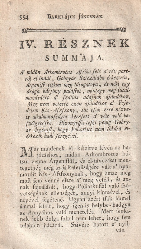 John Barclay (1582-1621) francia-skót származású író, költő, szatirikus, a neolatin irodalom meghatározó szerzője. Az angol királyi udvar befolyásos udvari költőjeként működő Barclay szatírái mellett több pápa- és jezsuitaellenes pamfletet írt. A katolikus neveltetését később egyre komolyabban vevő költő élete második felében Rómába költözött és az ottani irodalmi körökkel kötött barátságot. Argenis címmel írt kalandregénye a szerelmi történet mellett komoly politikai tendenciát mutat, a kalandregény szövetét olykor a helyes uralkodásról, az igazságos teherviselésről írt kitérők szakítják meg; egyes életrajzírói ezekben a részletekben a szerző főnemesség elleni tendenciáit vélték felfedezni. A politikai kitérőkkel vegyített barokk szerelmi kalandregény a XVII. század újlatin prózaírás egyik csúcsának számított. A sokak által csodált újlatin regény magyarra fordításával a XVIII. század végén többen is próbálkoztak: Kövesdi Boér Sándor erdélyi táblabíró és Fejér Antal eperjesi jegyző fordítása egyaránt 1792-ben jelent meg. Fordítónk, Fejér Antal az előszóban azzal a hazafias okkal magyarázza fordítását, hogy immár minden csinosodott nemzet lefordította az újlatin prózaírás ékességét, a magyar irodalom sem zárkózhat el tőle. Emlékezetes magyarsággal írt és némi szögletes bájjal bíró fordítása azonban nem lelt újabb kiadásra: a politikai tendenciájú újlatin kalandregény kissé késve érkezett a magyar piacra. A mű három kötetben teljes, kötetünk a háromkötetes munka befejező része.