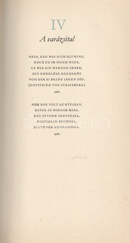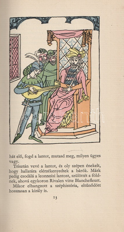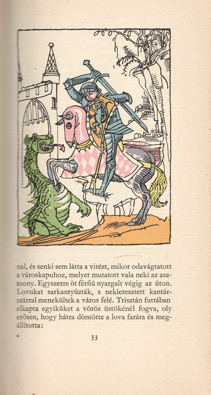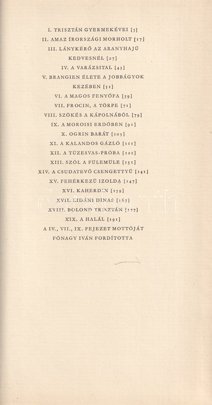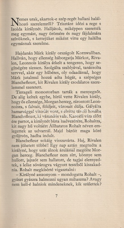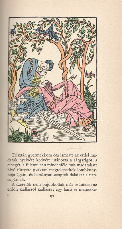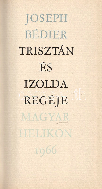 A breton irodalomtörténész, Joseph Bédier (1864-1938) főként szülőföldje középkori irodalmával foglalkozott. A középkor egyik legnevezetesebb szerelmi történetét 1900-ban ültette prózába. Lovagi történetének 1962-ben készült el magyar fordítása, példányunk a mű első bibliofil kiadása, oldalszámozáson belül Hegedüs István grafikusművész színes rajzaival.