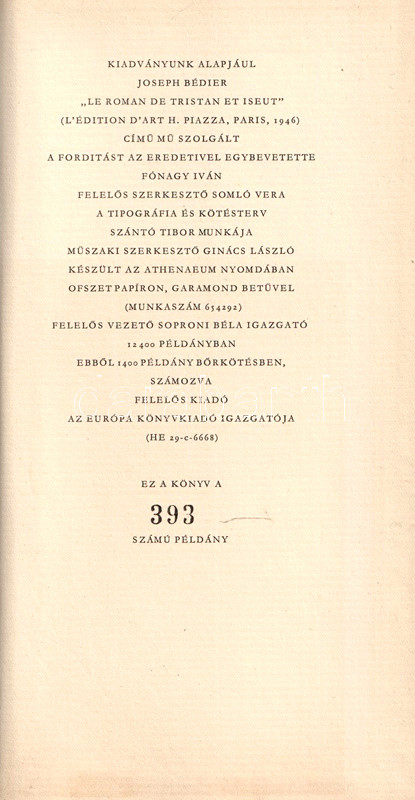 Könyvgyűjtők számára készült, számozott, bibliofil kiadás. Kolofon: "Kiadványunk alapjául Joseph Bédier "Le Roman de Tristan et Iseaut" (Paris, 1946) című mű szolgált. A fordítást az eredetivel egybevetette Fónagy Iván. A tipográfia és kötésterv Szántó Tibor unkája. Készült az Athenaeum Nyomdában ofszet papíron, Garamond betűvel, 12.400 példányban, ebből 1.400 példány bőrkötésben, számozva. Ez a könyv a 393. számú példány".