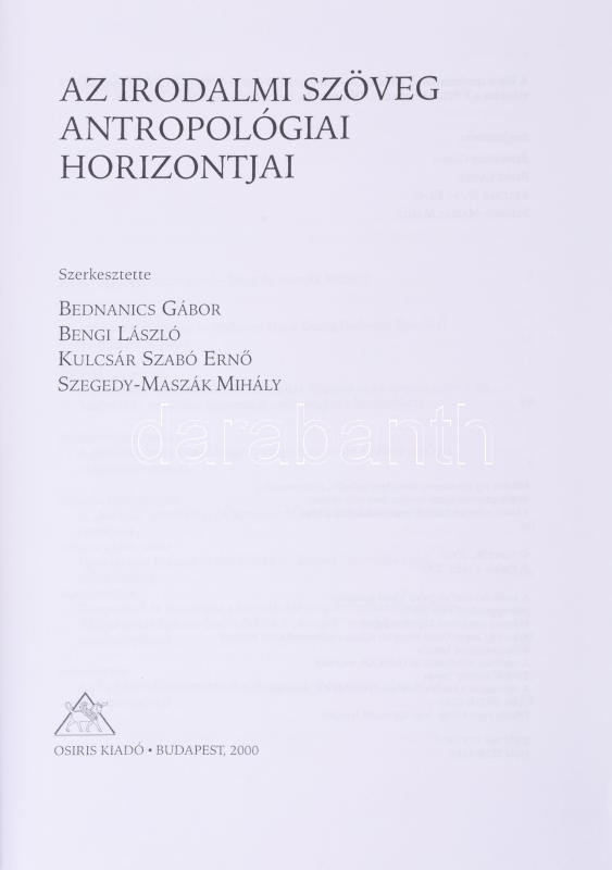 Bednanics-Bengi-Kulcsár-Szeged: Az irodalmi szöveg antropológiai horizontja. Bp., 2000. Osiris. Kiadói kartonált papírkötésben 560p. .