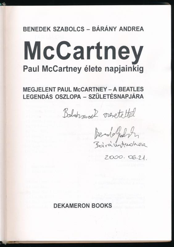 Benedek Szabolcs - Bárány Andrea: McCartney. Paul McCartney élete napj... https://www.darabanth.com/en/514-Auction-philately-postcards-numismatics-artwork-books-colletibles-jewelry/515.0/Books/Books-Other-rarities~633/Benedek-Szabolcs-Barany-Andrea-McCartney-Paul-McCartney-elete-napjainkig-Mindket-szerzo-a~II3412145