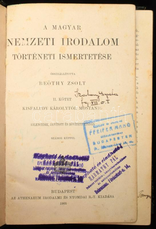 Beöthy Zsolt: A magyar nemzeti irodalom történeti ismertetése. Összeáll.: - - . II. köt.: Kisfaludy Károlytól mostanig. Bp., 1905, Athenaeum, 444 p. Átkötött félvászon-kötésben, viseltes állapotban, a gerincen kisebb sérülésekkel, helyenként kissé sérült, foltos lapokkal, bejegyzésekkel, firkákkal.