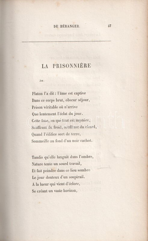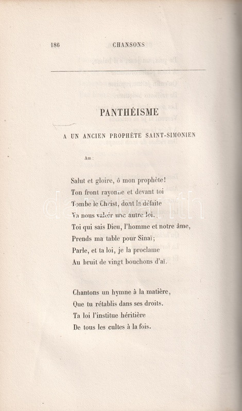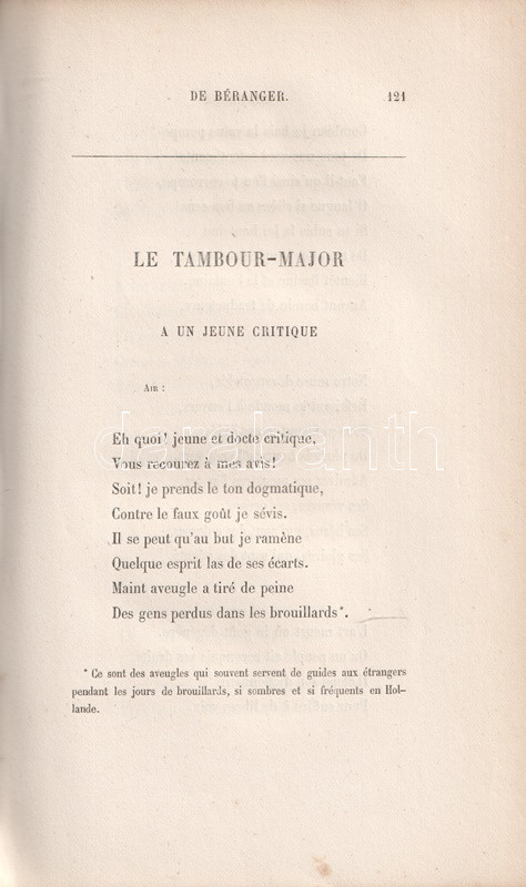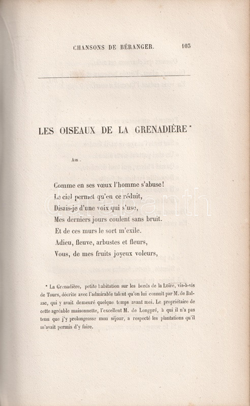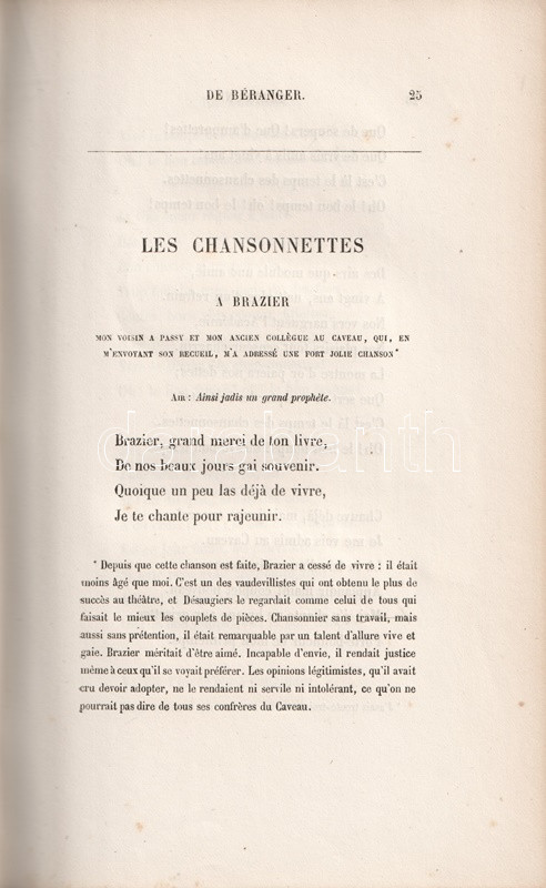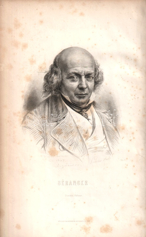 Pierre-Jean de Béranger (1780-1857) francia dalköltő, korának legnépszerűbb francia lírikusa. Közérthető, ironikus hangvételű dalai gyakran irányultak a politikai tekintélyek ellen. A költészete miatt többször is börtönre ítélt, ám befolyásos barátokkal bíró költő 1833-ban eladta kiadási jogait Perrotin könyvkereskedőnek, anyagi helyzete ezzel rendeződött. Politikai tendenciájú, népies hangú költészete Magyarországon Petőfi Sándorra tett markáns hatást. Kötetünk a költő érett korszakából való dalokat, sanzonokat teszi közzé.