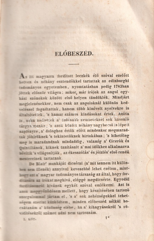 Hugh Blair (1718-1800) skót lelkész, morálfilozófus, szónok. Az Edinburgh-i egyetemen tartott retorikai előadásaiból írt kötete eredeti nyelven először 1783-ban jelent meg. A munkát a frissen alakult Magyar Tudományos Akadémia már korai ülésein felvette a feltétlenül lefordítandó alapművek közé. A mű két kötetben teljes.
