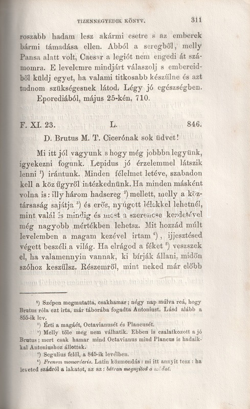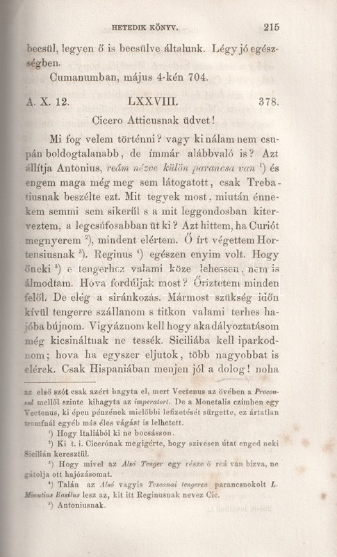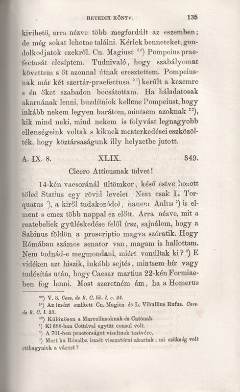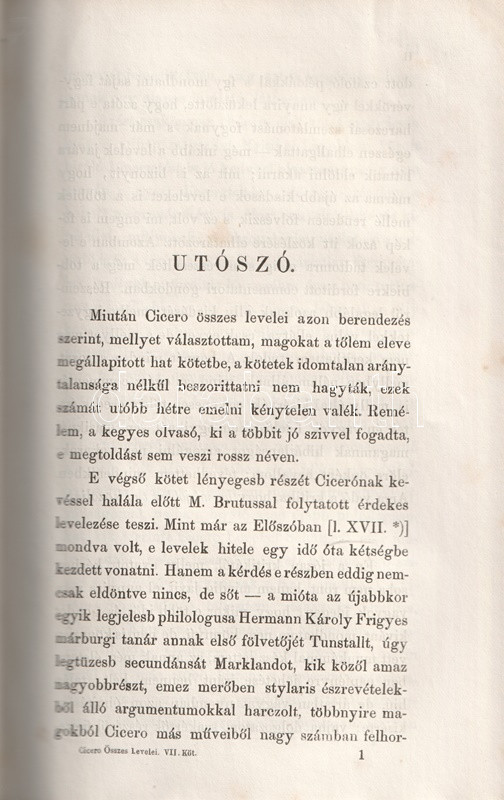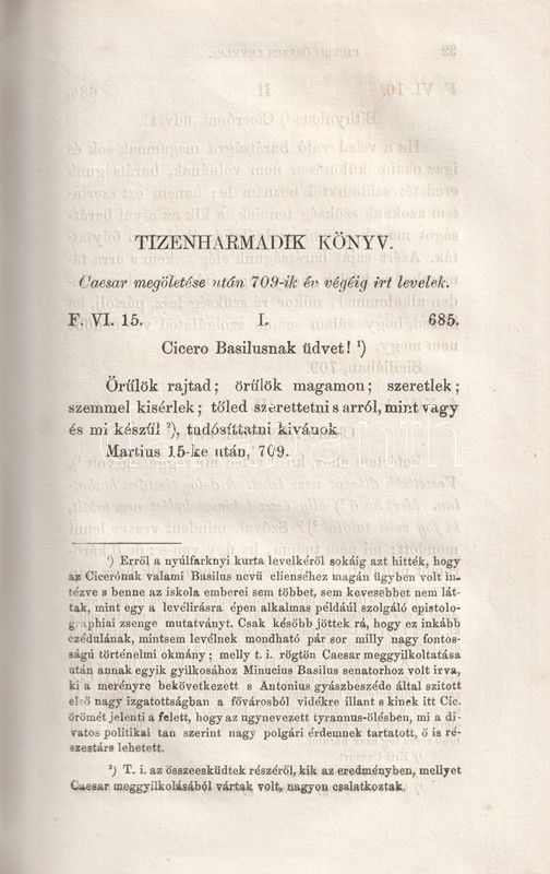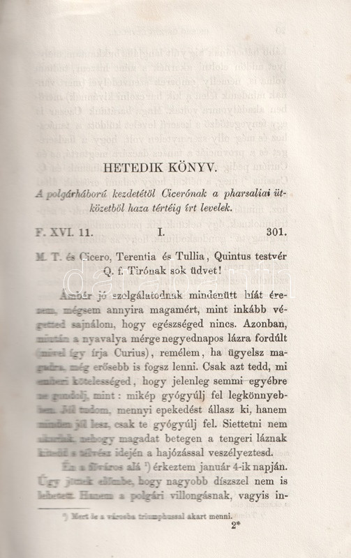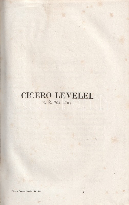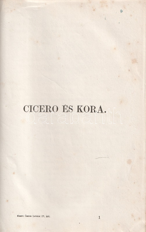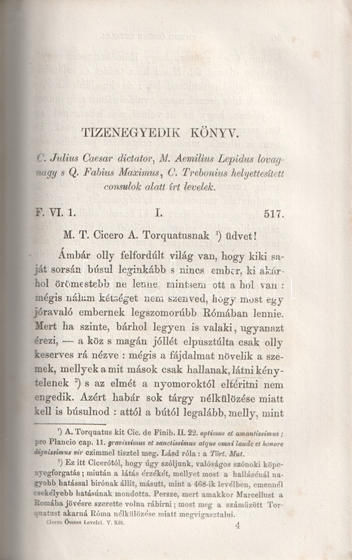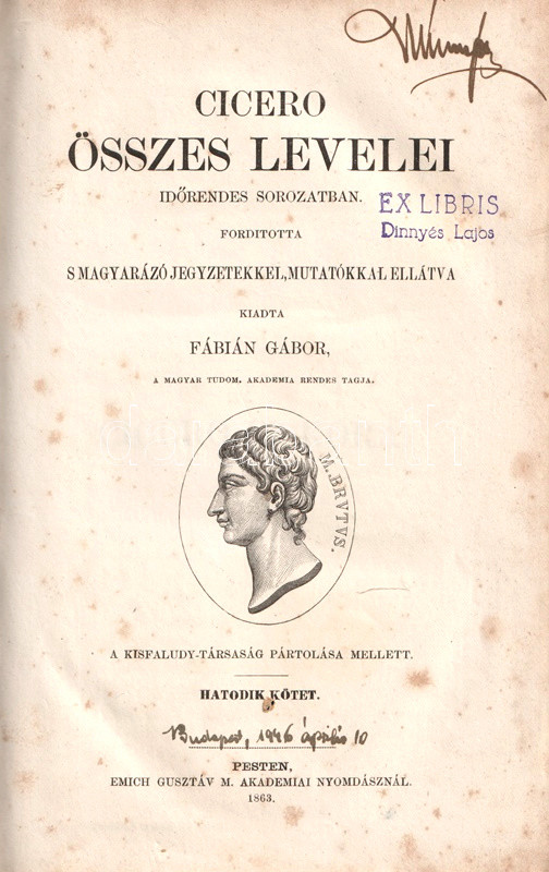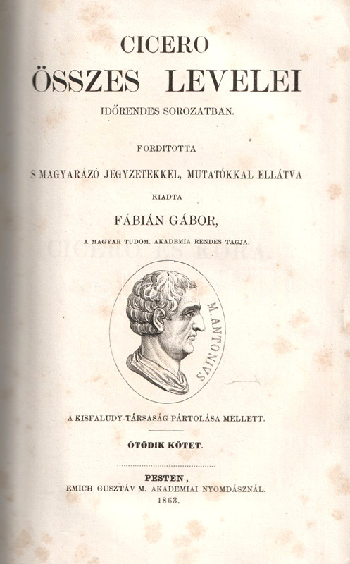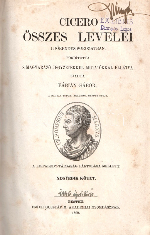 Cicero Összes levelei időrendes sorozatban. (Dinnyés Lajos, Magyarország miniszterelnökének saját kezű tulajdonosi névbejegyzésével és bélyegzésével.) Fordította s magyarázó jegyzetekkel, mutatókkal ellátva kiadta Fábián Gábor. IV-VII. kötet. [Két kötetbe kötve.]