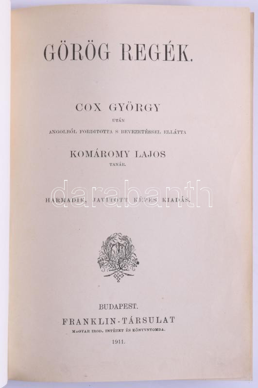 [Cox, George William] Cox György: Görög regék. Ford.: Komáromy Lajos. ... https://www.darabanth.com/en/514-Auction-philately-postcards-numismatics-artwork-books-colletibles-jewelry/515.0/Books/Books-Other-rarities~633/Cox-George-William-Cox-Gyorgy-Gorog-regek-Ford-Komaromy-Lajos-Bp-1911-Franklin-Tars~II3478509