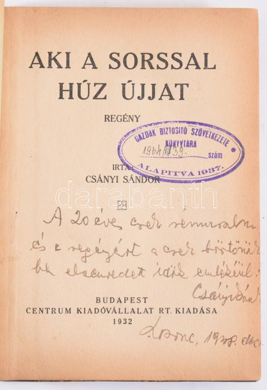 Csányi Sándor: Aki a sorssal húz újjat. Bp., 1932. Centrum. Dedikált! ...