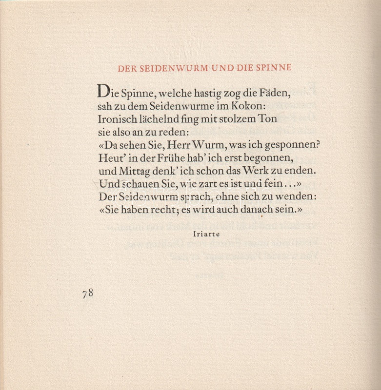 Könyvgyűjtők számára, 250 számozott példányban készült bibliofil kiadás. A Max Schwimmer német grafikusművész egész oldalas rajzaival illusztrált kötet a német és világirodalom rövid elbeszéléseiből, tanulságos meséiből válogat, Ezópusztól Heinéig.