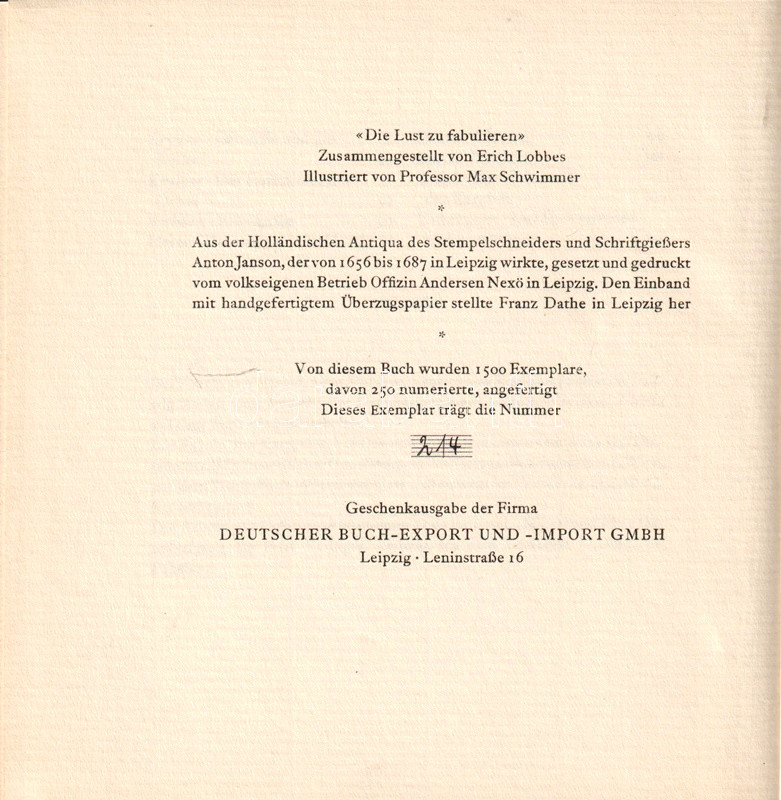 Kolofon: "Vom diesem Buch wurden 1500 Exemplare, davon 250 numerierte, angefertigt. Dieses Exemplar trägt die Nummer 214".