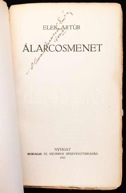 https://www.darabanth.com/en/514-Auction-philately-postcards-numismatics-artwork-books-colletibles-jewelry/515.0/Books/Books-Other-rarities~633/Elek-Artur-Alarcosmenet-Bp-1913-Nyugat-Kiadoi-papirkotes-gerinc-boritolap-serult-~II3402071