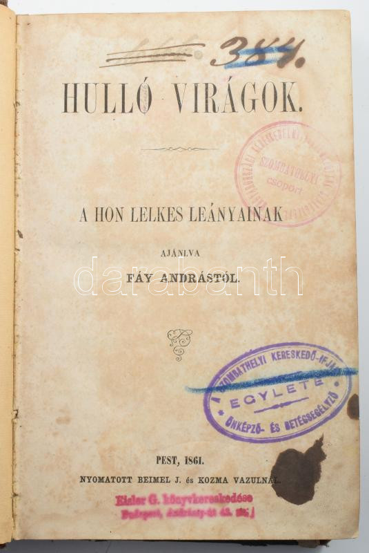 Fáy András: Hulló virágok. A hon lelkes leányainak. Pest, 1861, Beimel J. és Kozma Vazul. Félvászon kötés, viseltes állapotban.