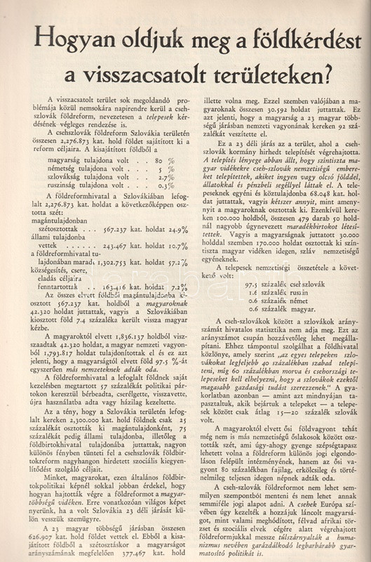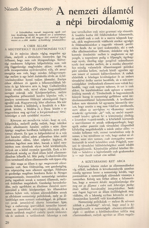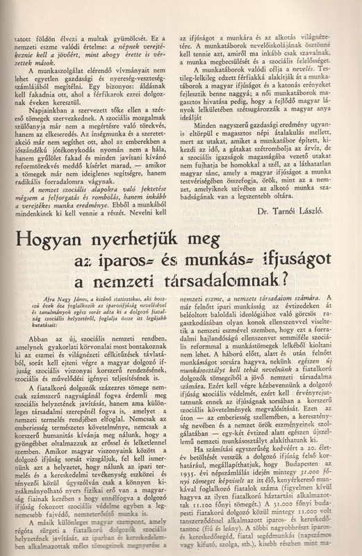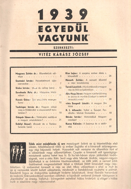 A tartalomból: Magyary Zoltán: Államéletünk válsága -- Szatmári István: Honvédelmünk újjászervezése -- Szvoboda Béla: Magyarok Moldvában -- Taubinger István: Hogyan oldjuk meg a földkérdést a visszacsatolt területeken? -- Gáspár János: Történelmi osztály-e a magyar arisztokrácia? -- Németh Zoltán: A nemzeti államtól a népi birodalomig -- Kiss Lajos: A szegény ember élete -- Áfra Nagy János: Hogyan nyerhetjük meg az iparos és munkás ifjúságot a nemzeti társadalomnak? -- Tarnói László: Munkatáborok a magyar nép és föld szolgálatában -- Erdélyi József: Ahasvér és Varázsfurulyás -- Karay Kálmán: A fasizmus és a zsidóság. Folyóiratunk szerepel az Ideiglenes Nemzeti Kormány által 1945-ben betiltott művek jegyzékén.