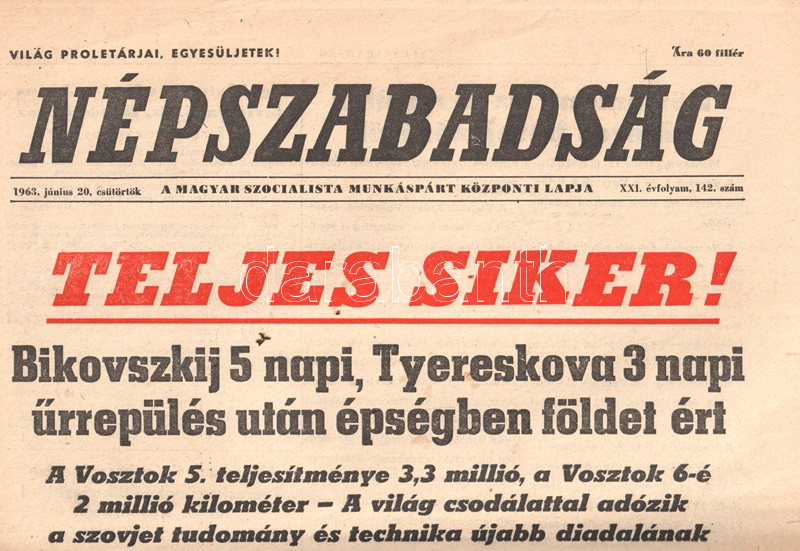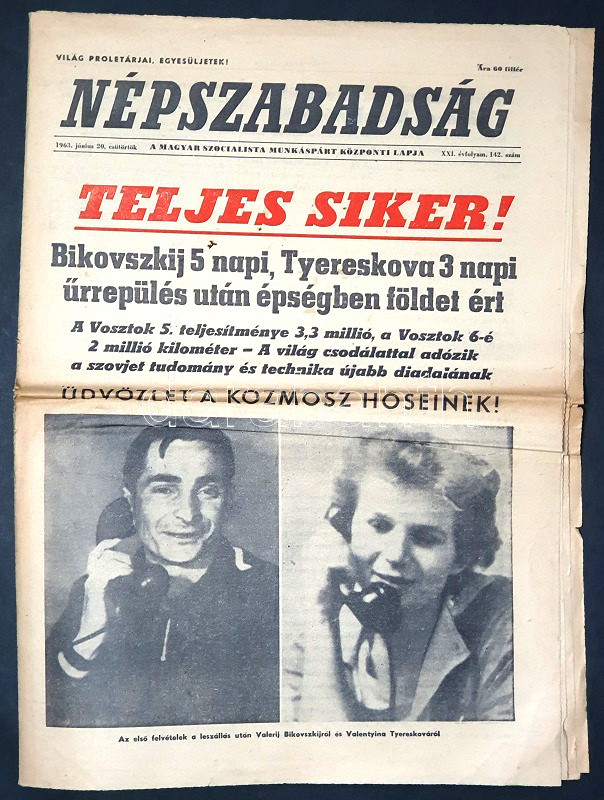[Folyóirat] "Teljes siker! Bikovszkij 5 napi, Tyereskova 3 napi űrrepülés után épségben földet ért. Üdvözlet a Kozmosz hőseinek!". A Népszabadság tematikus lapszáma. XXI. évfolyam, 142. szám. (1963. június 20.)