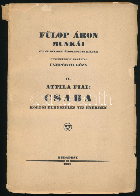 Fülöp Áron: Attila fiai III.: Csaba. Költői elbeszélés tíz énekben. Fülöp Áron Munkái IV. köt. Bp., 1929, Sylvester Irodalmi és Nyomdai Intézet Rt., 138+(2) p. Második, átdolgozott kiadás. Kiadói papírkötés, sérült borítóval, a hátsó borítón ázásnyomokkal, helyenként sérült lapokkal, nagyrészt felvágatlan.