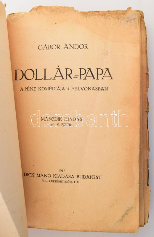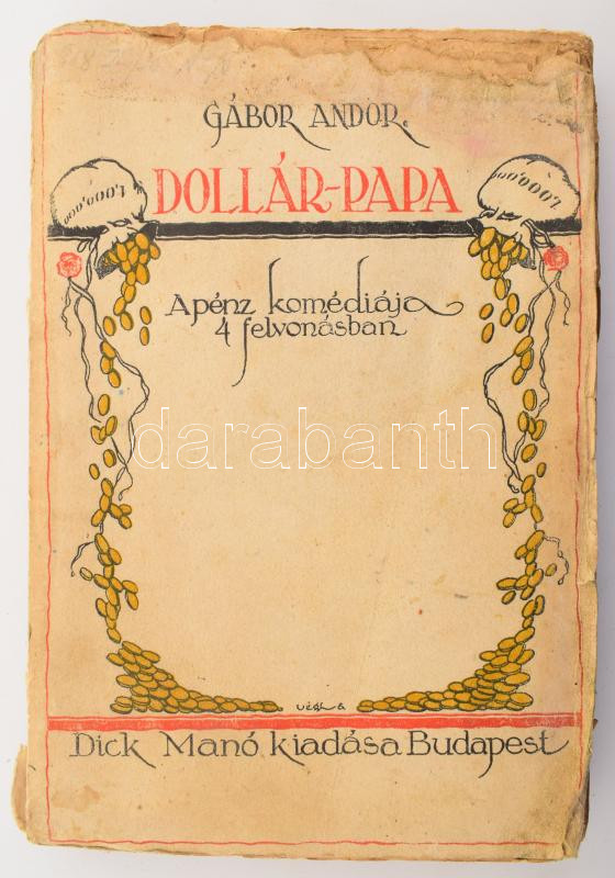 Gábor Andor: Dollár-papa. A pénz komédiája 4 felvonásban. A borító rajza Végh Gusztáv (1889-1973) munkája. Bp.,1917.),Dick Manó, 155+1 p. Kiadói illusztrált papírkötés, kopott, foltos borítóval, sérült gerinccel és borítóval, a címlap és az első 5 lap felső részén sérüléssel, foltos lapokkal, kissé sérült kötéssel, rossz állapotban.