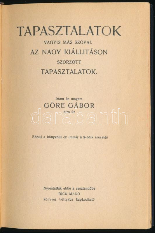 [Gárdonyi Géza] Göre Gábor: Tapasztalatok vagy más szóval az nagy kiállításon szörzött tapasztalatok. Írtam én magam - - bíró úr. Bp., 1925, Dick Manó,(Globus-ny.), 116 p.