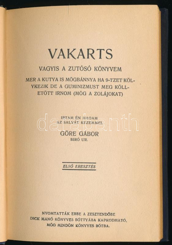 [Gárdonyi Géza] Göre Gábor: Vakarts vagyis a zutósó könyvem. Mer a kutya is mögbánnya ha 9-tzet kölykezik de guminizmust meg kölletött irnom (mög a zolájokat.)