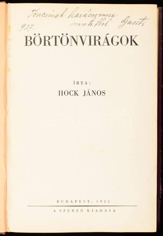 Hock János: Börtönvirágok. Bp., 1935, Szerző. Félvászon kötés, ajándkozási sorokkal, kopottas állapotban.