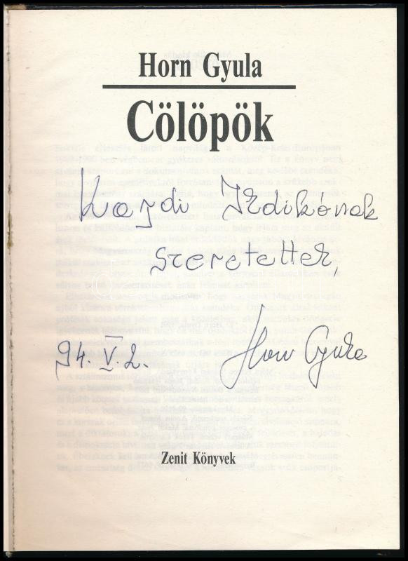 Description: Horn Gyula: Cölöpök. A szerző, Horn Gyula (1932-2013) politikus, külügyminiszter, 1994 és 1998 között miniszterelnök által dedikált példány. Bp., 1992, Zenit Könyvek. Második kiadás. Kiadói kartonált papírkötés.