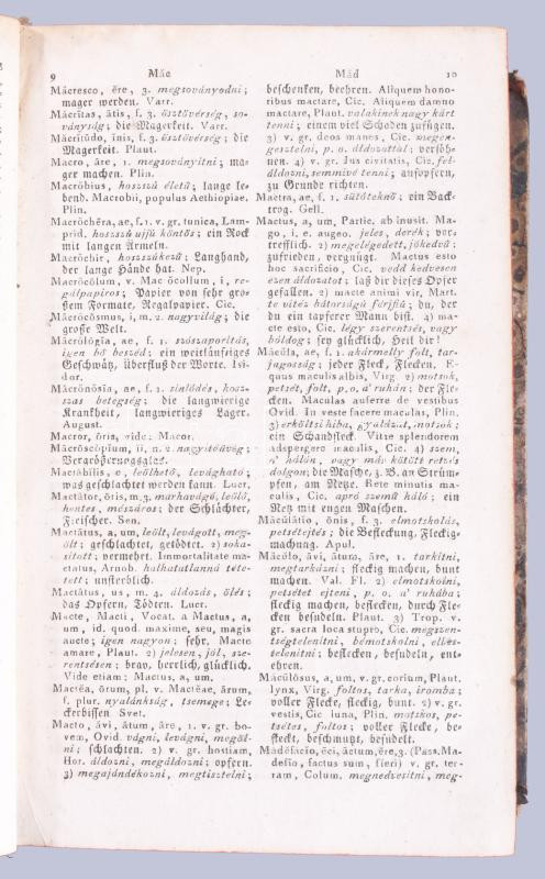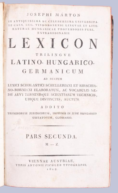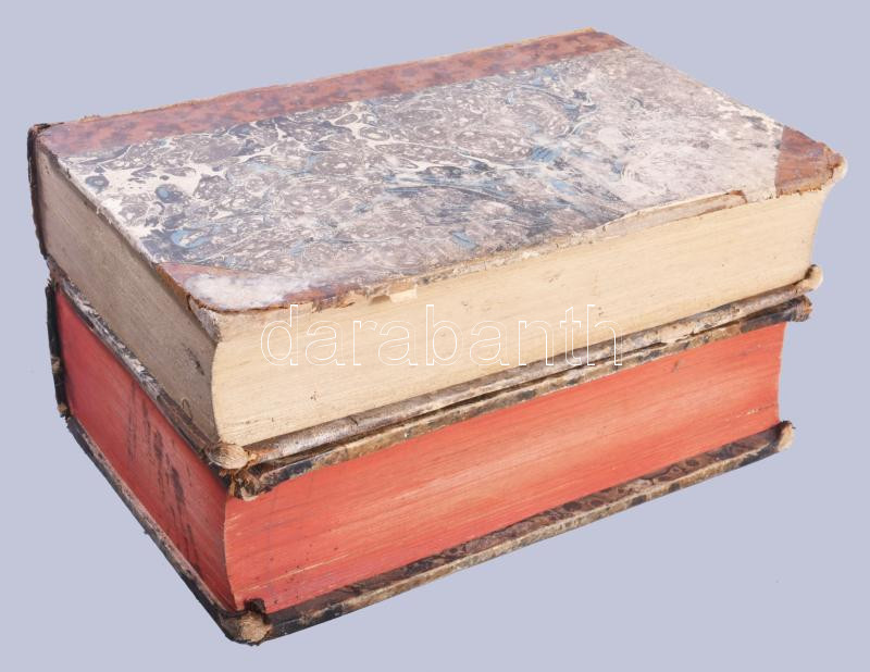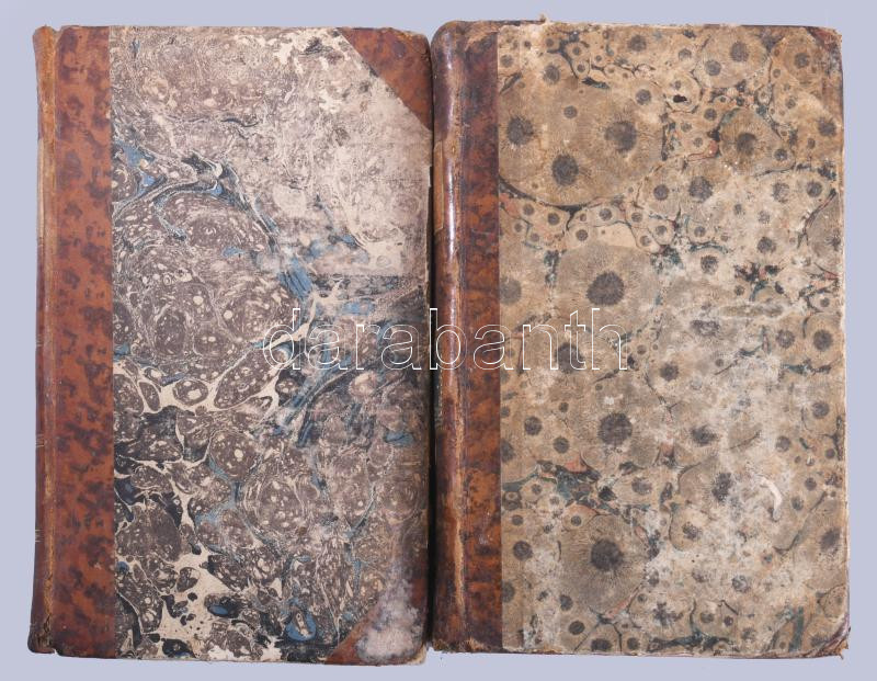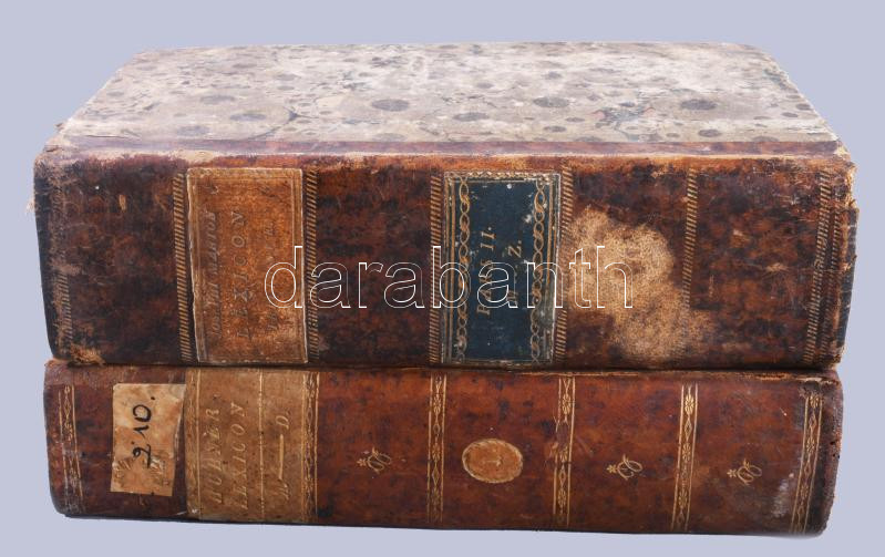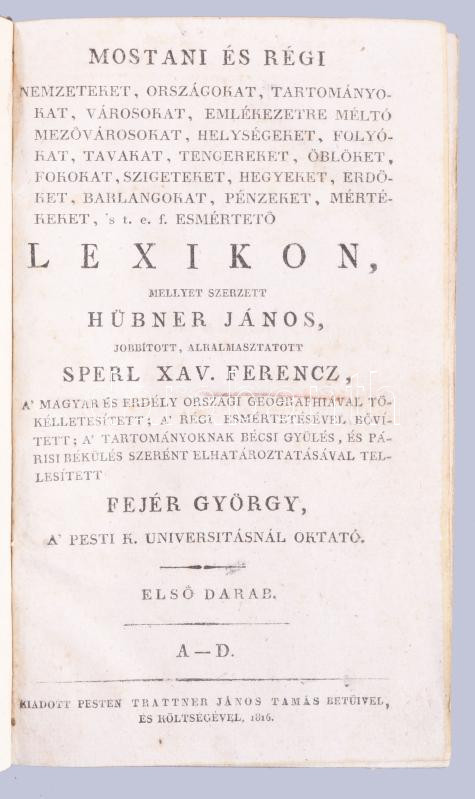 [Johann Hübner] Hübner János: Mostani és régi nemzeteket, országokat, tartományokat, városokat, emlékezetre méltó mezővárosokat, helységeket, folyókat, tavakat, tengereket, öblöket, fokokat.szigeteket, hegyeket, erdőket, barlangokat, pénzeket, mértékeket, 's t. e. f. esmértető Lexikon, mellyet szerzett Hübner János, jobbított, alkalmasztatott Sperl Xav. Ferencz, a' Magyar és Erdély országi geographiával tökélletesített; a' régi esmértetésével bővített; a' tartományoknak bécsi gyülés, és párisi békülés szerént elhatároztatásával tellesített Fejér György. Első darab, A-D, Második darab M-Z. Pest, 1816-1818., Trattner János Tamás, XXIV. 708 + (2)p.; I 1853p, 64p. Egyetlen kiadás. Korabeli aranyozott félbőr kötésben