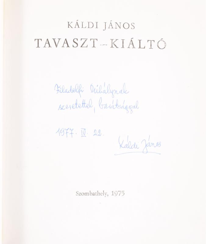 https://www.darabanth.com/en/514-Auction-philately-postcards-numismatics-artwork-books-colletibles-jewelry/515.0/Books/Books-Other-rarities~633/Kaldi-Janos-Tavaszt-kialto-DEDIKALT-Szombathely-1975-Vas-Megye-Tanacsa-Megjelent-1000-p~II3482502