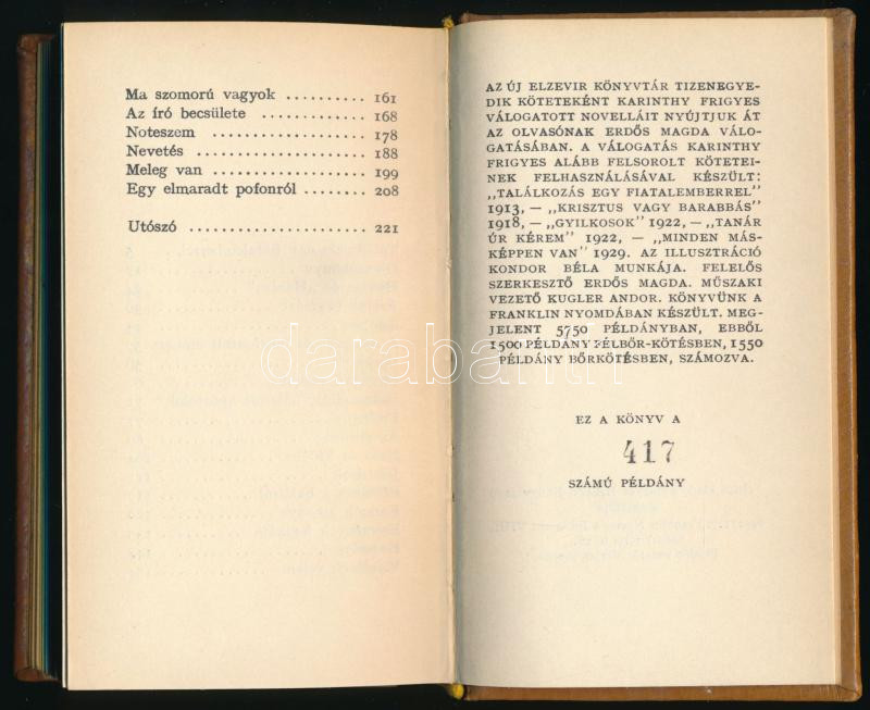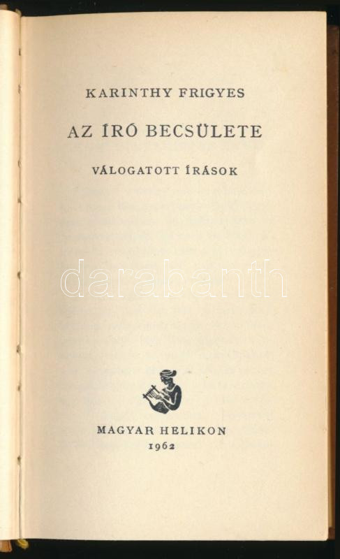 Karinthy Frigyes: Az író becsülete. Válogatott írások. 417. számozott ... https://www.darabanth.com/en/514-Auction-philately-postcards-numismatics-artwork-books-colletibles-jewelry/515.0/Books/Books-Other-rarities~633/Karinthy-Frigyes-Az-iro-becsulete-Valogatott-irasok-417-szamozott-peldany-1962-Magyar~II3476170