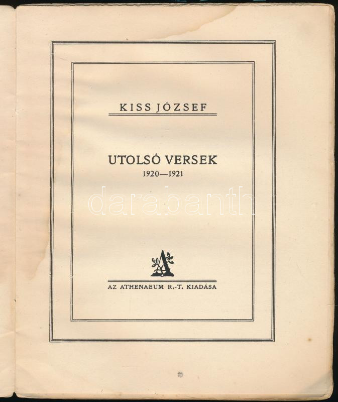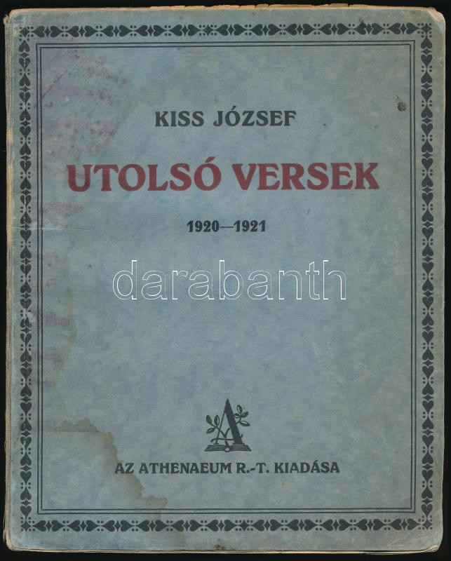 https://www.darabanth.com/en/514-Auction-philately-postcards-numismatics-artwork-books-colletibles-jewelry/515.0/Books/Books-Other-rarities~633/Kiss-Jozsef-Utolso-versek-1920-1921-Bp-1921-Athenaeum-Kiadoi-papirkotes-azasnyommal~II3476206