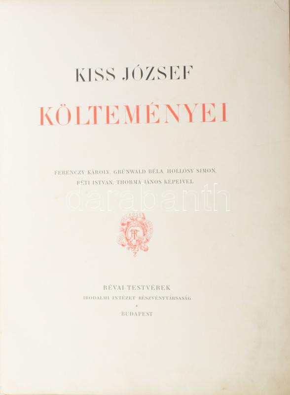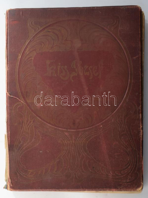 Kiss József költeményei. Ferenczy Károly, Grünwald Béla, Hollósy Simon, Réti István, Thorma János képeivel. Bp., [1897], Révai, 191+[5] p.+ 31 t. Kiadói szecessziós egészvászon-kötés, Gottermayer-kötés, viseltes borítóval, hiányzó gerinccel, helyenként kissé foltos, koszos lapokkal.