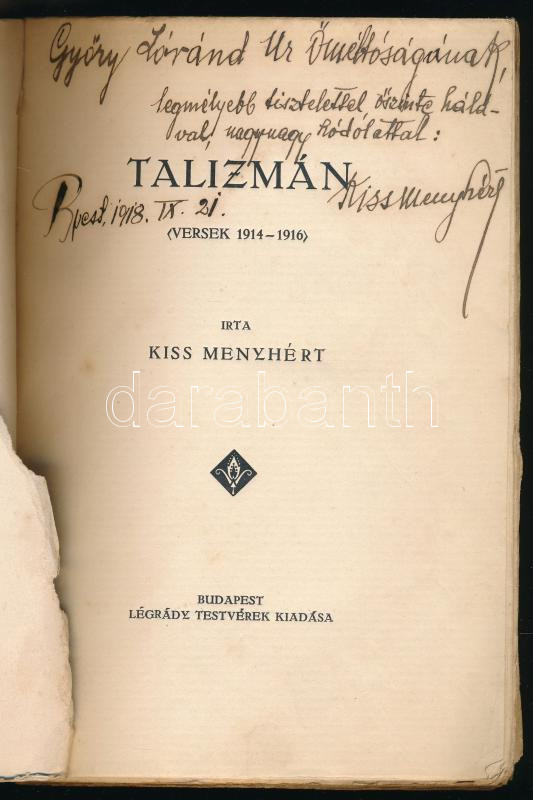 Kiss Menyhért: Talizmán. (Versek 1914-1916.) A szerző, Kiss Menyhért (1880-1934) költő, író, tanár által Győry Loránd (1871-1926) politikus, földművelésügyi miniszter részére dedikált példány. Bp., [1917], Légrády, 151+(1) p. Kiadói papírkötés, sérült borítóval és gerinccel, felvágatlan lapokkal.