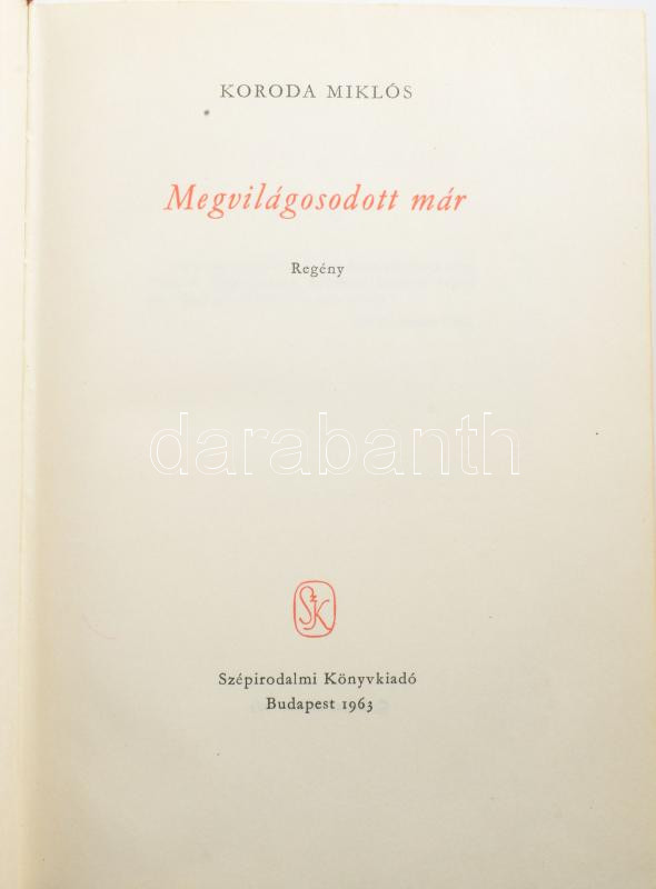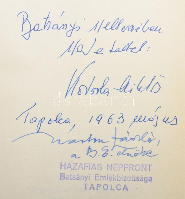 Koroda Miklós: Megvilágosodott már. [Batsányi János életének regénye.] A szerző, Koroda Miklós (1909-1978) író és Marton László (1900?1976) tanár, a Batsányi János Emlékbizottság egykori elnökének által DEDIKÁLT példány! "Batsányi szellemében szeretettel: Koroda Miklós Tapolca, 1963 május. Marton László a B. E. elnöke." és "Hazafias Népfront Batsányi Emlékbizottsága Tapolca" bélyegzéssel. Bp., 1963, Szépirodalmi, 563+3 p. Kiadói félvászon-kötés, kissé kopott borítóval.