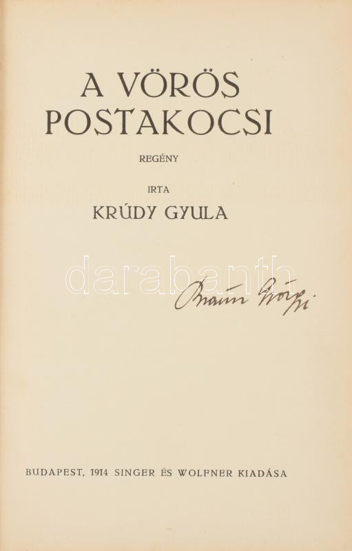 Krúdy Gyula: A vörös postakocsi. Krúdy Gyula összegyűjtött munkái. Bp.... https://www.darabanth.com/en/514-Auction-philately-postcards-numismatics-artwork-books-colletibles-jewelry/515.0/Books/Books-Other-rarities~633/Krudy-Gyula-A-voros-postakocsi-Krudy-Gyula-osszegyujtott-munkai-Bp-1914-Singer-es-Wol~II3456702