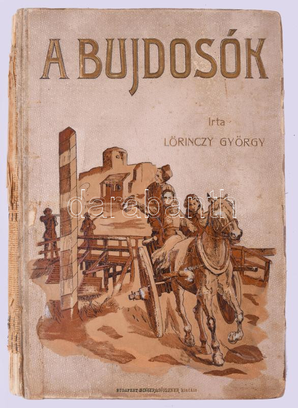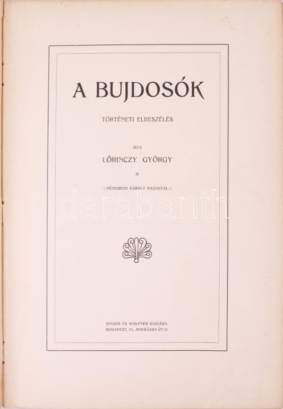 Lőrinczy György: A bujdosók. Történeti elbeszélés. Mühlbeck Károly rajzaival. Bp., [1902], Singer és Wolfner, 194+(6) p.+ 4 t. Első kiadás. Szövegközti és egészoldalas illusztrációkkal. Kiadói aranyozott, dombornyomott félvászon-kötés, viseltes, foltos borítóval, hiányzó gerinccel, helyenként kissé foltos lapokkal.