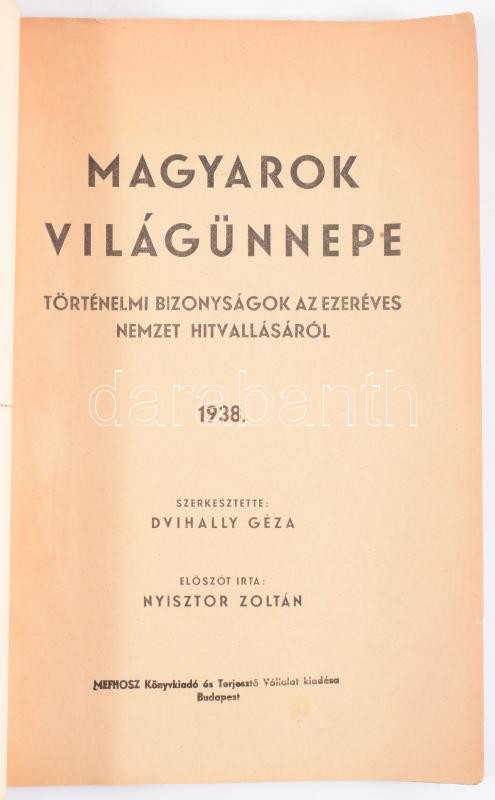 Description: Magyarok világünnepe. Történelmi bizonyságok az ezeréves nemzet hitvallásáról. Szerk.: Dvihally Géza, előszó: Nyisztor Zoltán. Bp., 1938, MEFHOSZ Könyvkiadó és Terjesztő Vállalat. kiadói papírkötésben,