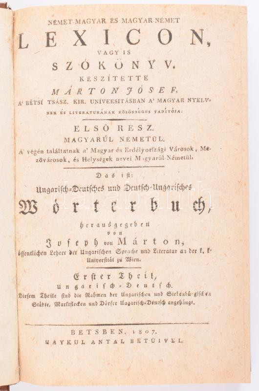 Description: Márton Jó[z]sef: Német - magyar és magyar - német lexicon, vagy is szókönyv. Készítette: - -. Első rész: Magyarul és németül. Béts, 1807, Haykul Antal, 12+816 [kéthasábos számozás]+1+404 [kéthasábos számozás]+6 p. Magyar és német nyelven. Későbbi félbőr-kötés,
