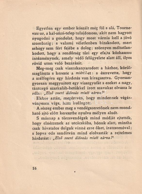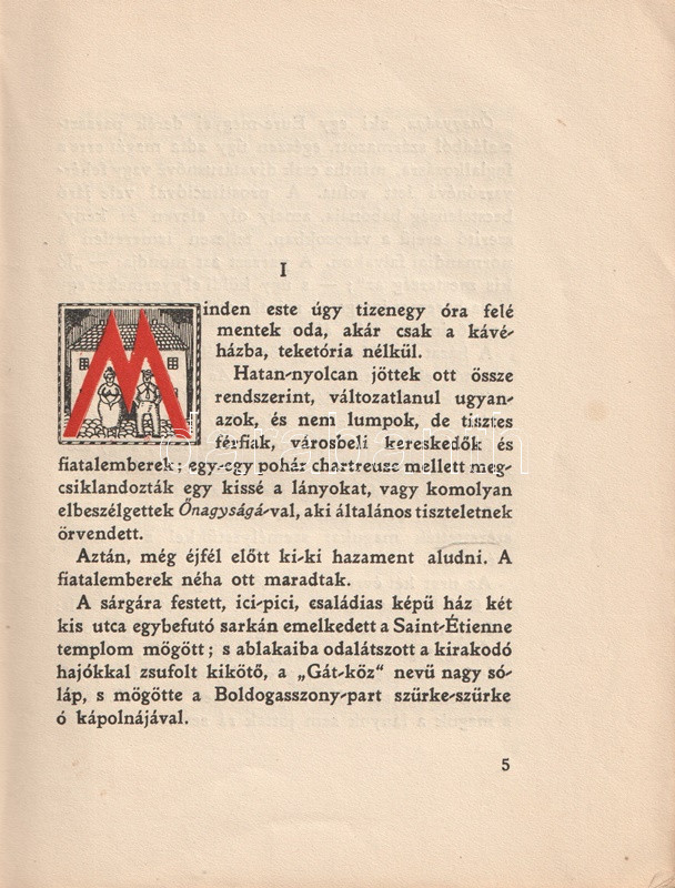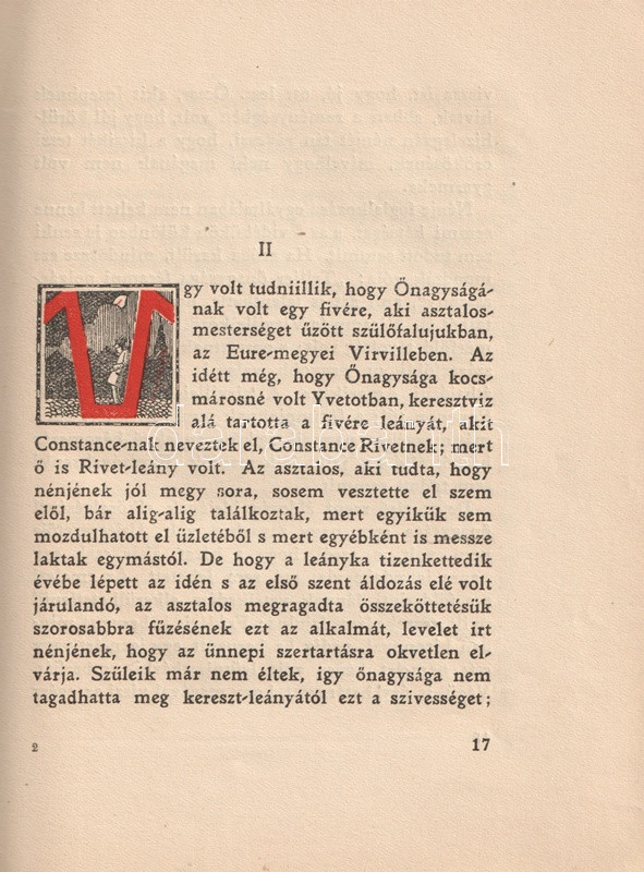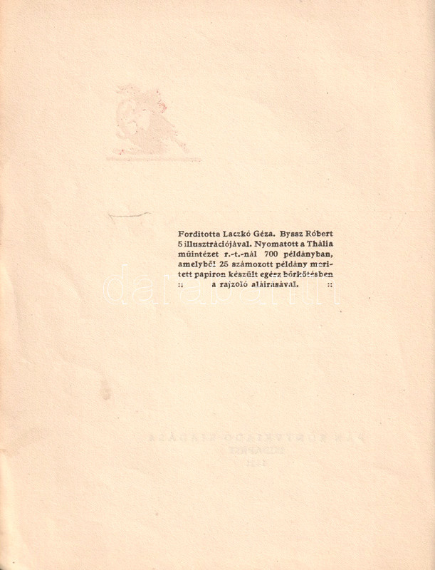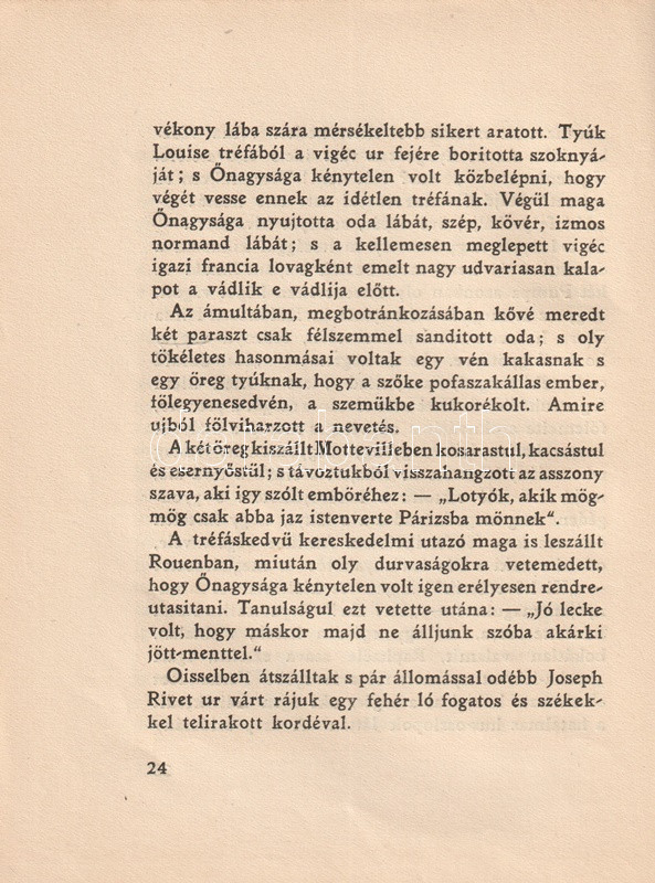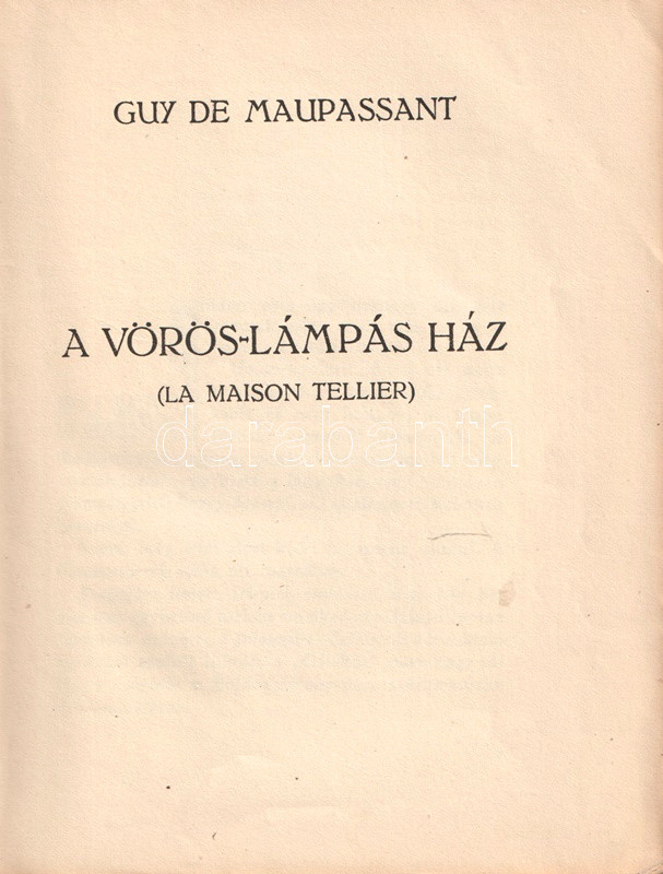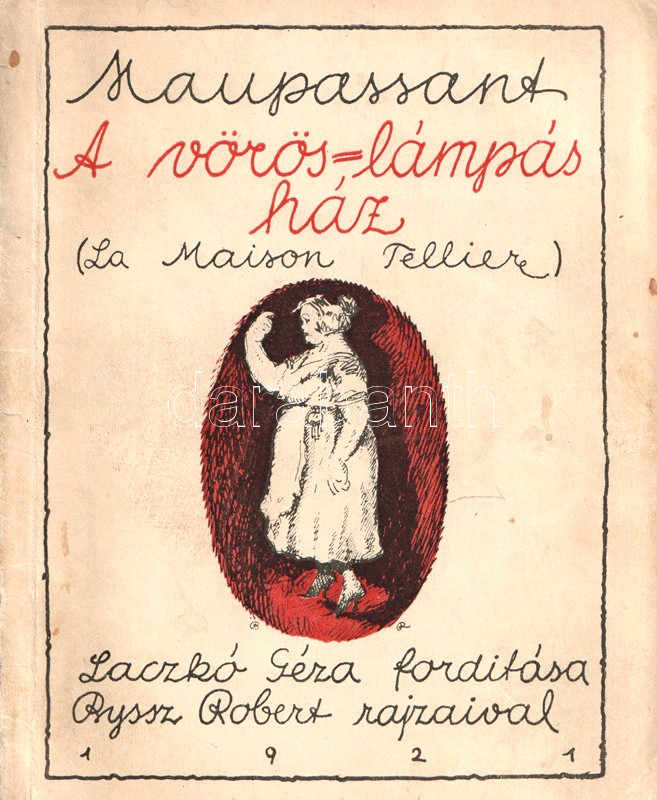 Kolofon: "Byssz Róbert 5 illusztrációjával. Nyomatott a Thália Műintézet Rt.-nél 700 példányban, amelyből 25 számozott példány merített papíron készült, egész bőrkötésben, a rajzoló aláírásával". Példányunk bőrkötésű, de számozatlan. Guy de Maupassant (1850-1893) francia elbeszélő irodalmi munkássága az 1880-as évek vidéki és párizsi életének szórakoztató, frivol tükörképe. Munkásságának magyar fordítása korán megkezdődött, az 1890-es években számos elbeszéléskötete megjelent magyarul is. "La maison Tellier" című nyilvánosházi elbeszélése önálló kötetként 1921-ben két magyar fordításban is megjelent. Példányunk a Laczkó Géza-féle, korlátozott példányszámban megjelent kiadásból való, Byssz Róbert erotikába hajló illusztrációival.