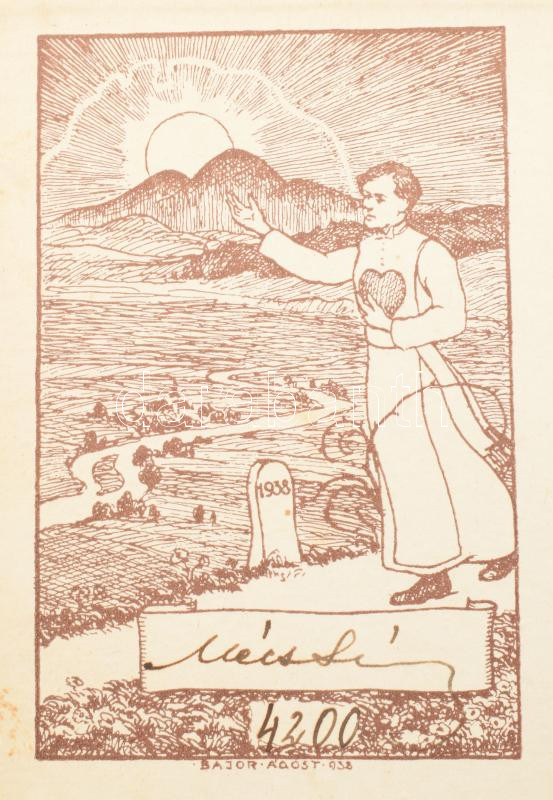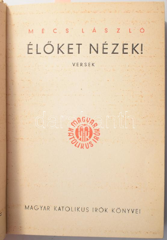 Mécs László: Élőket nézek! Versek. Számozott, 4200. számú, kézzel számozott példány. A szerző, Mécs László (1895-1978) költő saját kezű aláírásával, Bajor Ágost ex libris-ével. Bp., [1938], Magyar Katolikus Írók, 146+(1) p. Első kiadás. Kiadói aranyozott egészvászon-kötés, kissé foltos, kissé kopott borítóval, a gerincen apró sérüléssel.