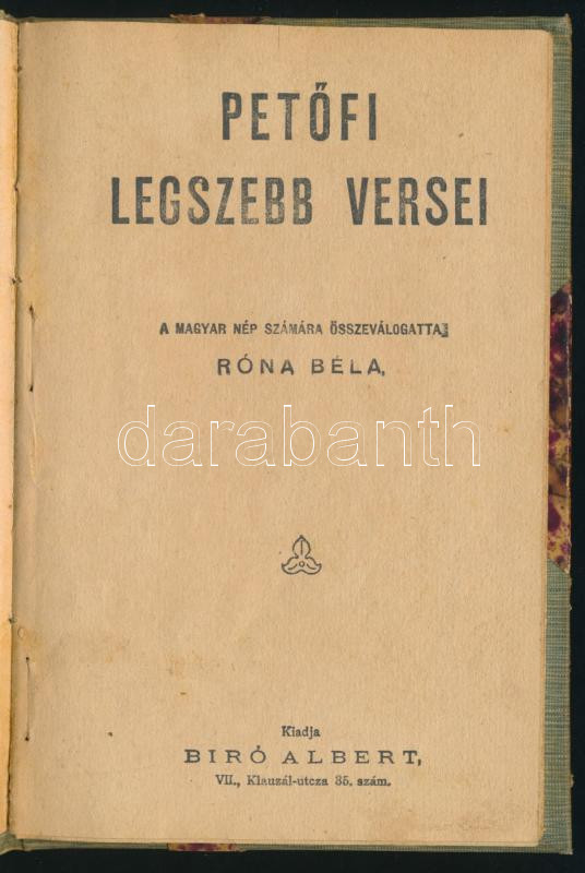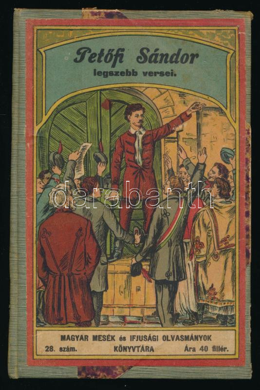 Description: Petőfi Sándor legszebb versei. A magyar nép számára összeválogatta: Róna Béla. Magyar mesék és ifjúsági olvasmányok 28. sz. [Bp.], é.n., Biró Albert, 32 p. Félvászon-kötésben.