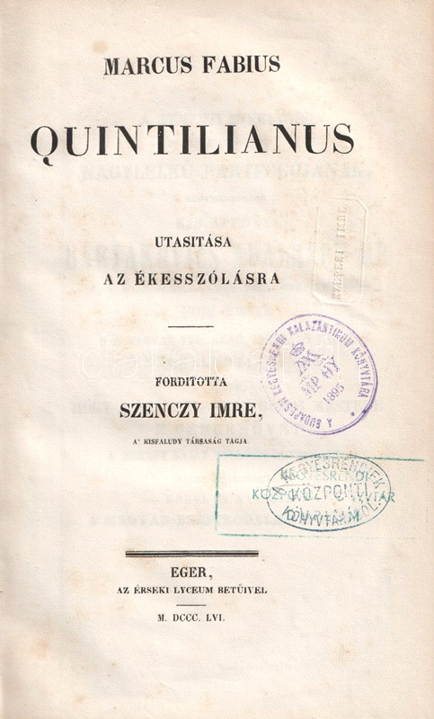 Quintilianus utasítása az ékesszólásra. Fordította Szenczy Imre.