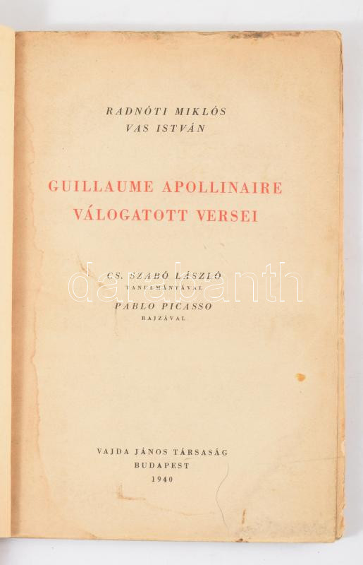 Radnóti Miklós-Vas István: Guillaume Apollinaire válogatott versei. Bp... https://www.darabanth.com/en/514-Auction-philately-postcards-numismatics-artwork-books-colletibles-jewelry/515.0/Books/Books-Other-rarities~633/Radnoti-Miklos-Vas-Istvan-Guillaume-Apollinaire-valogatott-versei-Bp-1940-Vajda-Janos-Tar~II3480493